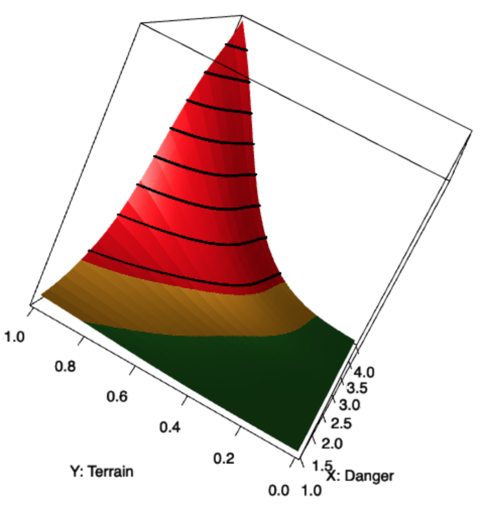 La figure ci-dessus donnant la MRQ est peu explicite sur le fait qu’elle montre que le risque relatif varie de manière exponentielle avec à la fois le terrain et le degré de danger : il faut regarder les valeurs sur les isocontours. Les figures suivantes montrent la même surface mais en trois dimensions, issue de https://