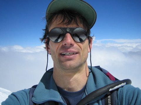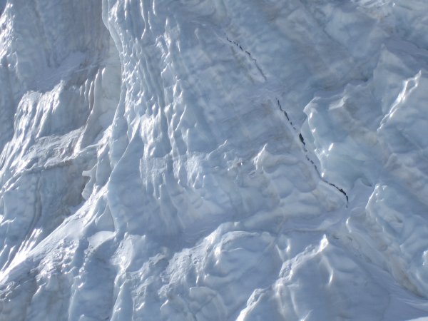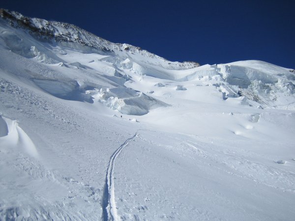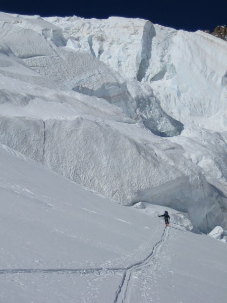 Trace qui serpente entre crevasses éparses et béantes, et séracs, ces murailles de glace vive qui en imposent et défient la pesanteur, tout en reflétant le Soleil sur une incroyable palette de couleurs aux tons bleutés. Moi, j’avance au ralenti. Je suis mort. Le manque de sommeil de ces derniers jours se fait cruellement sentir. Vraiment cruellement. Ça, plus un peu d’hypoglycémie, probablement, et ce malgré les kilos de bouffe que je trimbale depuis le bas dans mon dos — pas envie d’ingurgiter quoi que ce soit. Bref, je m’arrête tous les dix pas (je sais j’ai compté ; OK, parfois je vais jusqu’à quinze, voire vingt...). Ceci étant j’ai encore la force de profiter du paysage qui m’entoure, voire de l’immortaliser sur la surface sensible du capteur de mon appareil photo. Pourtant, j’ai peur de ne pas arriver au sommet. Je ferais bien une petite pause en forme de petit somme. Mais non, ce n’est pas possible. Continuer, c’est la seule solution.
