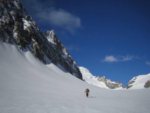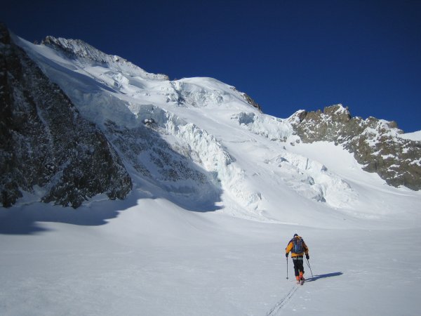 Bon, en attendant, j’ai encore de l’énergie. Alors j’avance. Le Soleil s’est levé il y a peu de temps, embrasant le Pelvoux d’une lumière nouvelle. Il fait super beau, mais une inquiétante vague de nuage déborde par la crête au nord. Le processus reste stable. Pour l’instant. Arrivés quasiment en haut de la pente raide qui permet de franchir le verrou, nous rechaussons les skis. La pente s’adoucit, s’aplanit. Devant nous, une immense plaine immaculée. Le glacier. Là-bas, à droite, le refuge des Écrins, qui domine l’étendue glaciaire, perché sur son promontoire rocheux. Nous entamons la traversée de ce désert de neige et de glace. À chaque pas, la masse imposante de la face nord de la Barre se découvre un petit peu plus. Le paysage est superbe. À couper le souffle. Mais non, je ne l’ai pas encore coupé, le souffle. Il en reste un peu. Le pied de la face paraît à portée de spatule. Dans un quart d’heure tout au plus, nous y serons. Il n’en est rien. Le plat dure. Mais la beauté et la magie de l’endroit perdurent. Il nous faudra une heure pour en venir à bout. Pour arriver au bout. En fait j’étais tellement subjugué par la beauté environnante que je n’ai pas vu le temps passé. Les Patrick, tout blasés qu’ils sont, n’ont subit que la longueur. Et de fait, c’est long. Mais c’est beau, surtout !