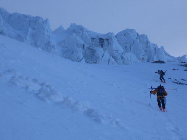 Je profite de la pause pour enfiler le baudrier qui pourrait servir au moment de traverser le glacier. La neige est dure, gelée, nous mettons les couteaux. C’est parti. Nous passons par la gauche du glacier, plus enneigée, pour passer au-dessus du verrou. Nous traversons une zone d’avalanches de neige humide, amoncellement chaotique de grosses boules de neige figées par le gel. Pas facile, facile en skis. De fait, nous finissons par déchausser. À nouveau les skis sur le dos. Pffff... C’est qu’ils sont lourd les saloupiauts. Je commence à plier doucettement sous la charge, moi ! En conséquence de quoi, je commence à traîner un peu la patte aussi. Les Patrick sont déjà devant. Je ne les reverrai plus avant le sommet. Le mien de Patrick m’attend encore un peu. Pas dans mon assiette, moi, aujourd’hui. D’habitude je suis en meilleure forme. Nous n’avons fait qu’un peu plus de mille mètres, et je tire déjà la langue. À la moitié. C’est de bonne augure, ça... C’est vrai que j’ai un peu de sommeil en retard. D’ailleurs en ce jeudi de l’ascension je pensais rester tranquillement à la maison, et récupérer un peu. Mais non. Me voilà en train de crapahuter en montagne. Chacun fête ses réussites comme il peut !