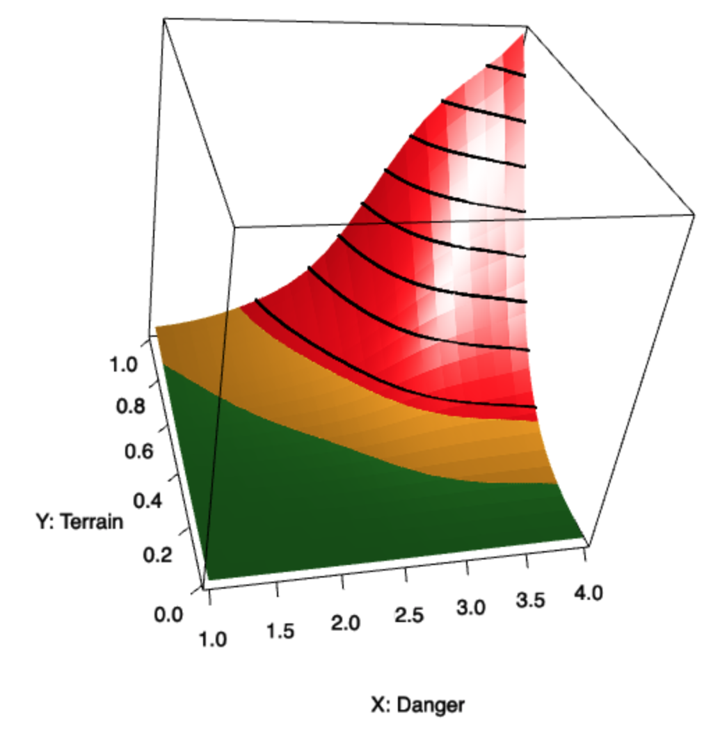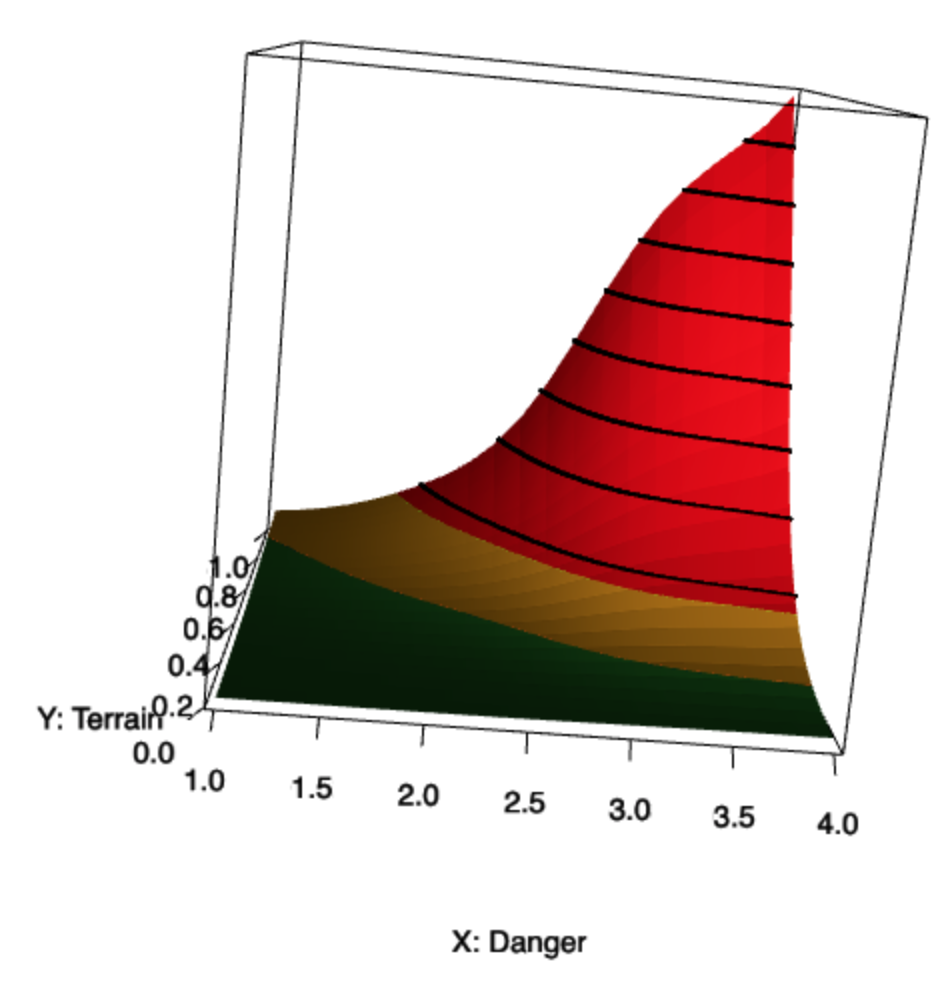 La figure ci-dessus donnant la MRQ est peu explicite sur le fait qu’elle montre que le risque relatif varie de manière exponentielle avec à la fois le terrain et le degré de danger : il faut regarder les valeurs sur les isocontours. Les figures suivantes montrent la même surface mais en trois dimensions, issue de https://